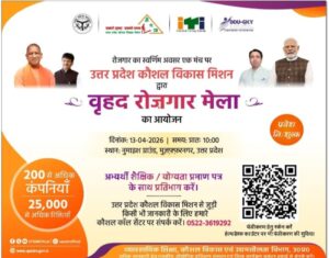 *एटा 11 अप्रैल 2026 (सू0वि0)।* जिला समन्वयक उ0प्र0 कौशल विकास मिशन दीपक कुमार यादव ने जानकारी देते हुए बताया कि मा0 मुख्यमंत्री जी, उत्तर प्रदेश सरकार की गरिमामयी उपस्थिति में उ0प्र0 कौशल विकास मिशन के अंतर्गत दिनांक 13 अप्रैल 2026 को जनपद मुजफ्फरनगर के नुमाइश ग्राउंड में वृहद रोजगार मेले का आयोजन किया जा रहा है।
