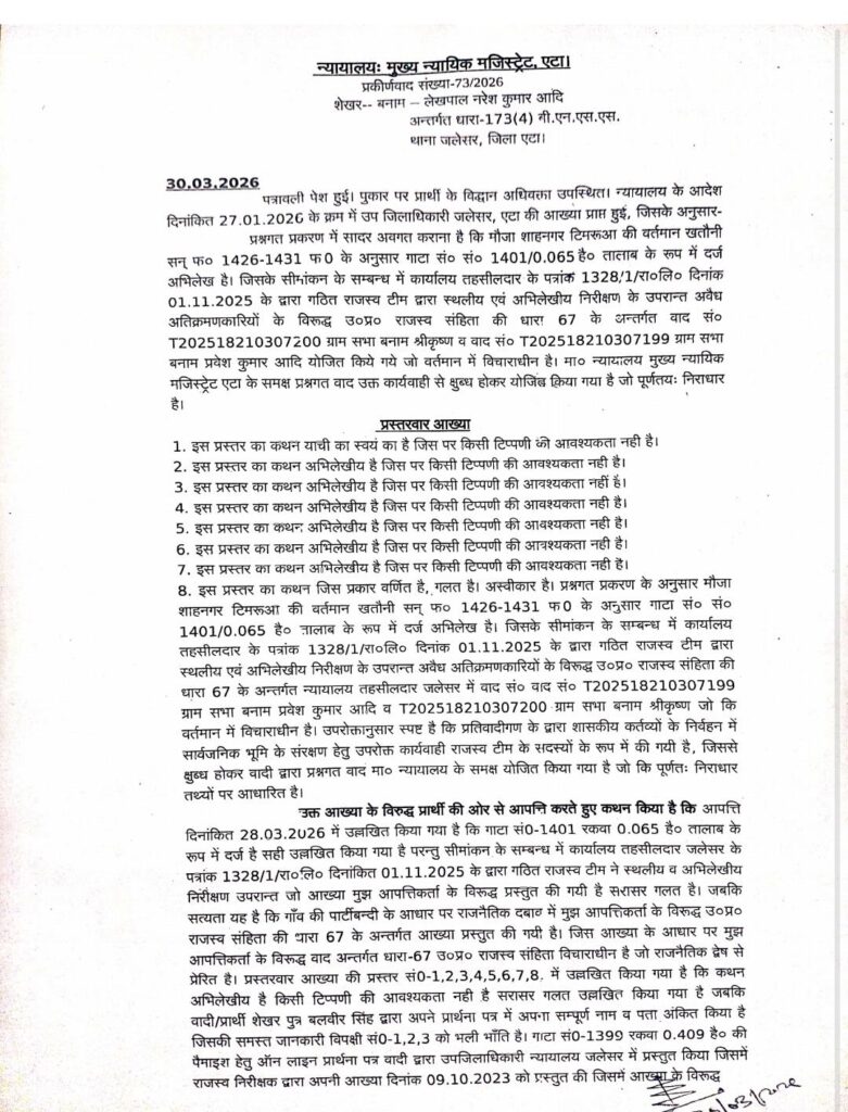 प्रकरण संख्या 73/2026 में वादी शेखर कुमार उर्फ शेखर सिंह द्वारा दाखिल वाद में गाटा संख्या 1401 (रकबा 0.065 हेक्टेयर) को तालाब की भूमि बताया गया है, जो मोहननगर टिमरुआ (या शाहनगर टिमरुआ) क्षेत्र में स्थित है। तहसीलदार जलेसर द्वारा जारी पत्रांक 1328/1/रा०लि० दिनांक 01.11.2025 के अनुसार, उक्त भूमि पर प्रवेश कुमार, श्रीकृष्ण सहित अन्य लोगों द्वारा अवैध कब्जा किया गया है।
