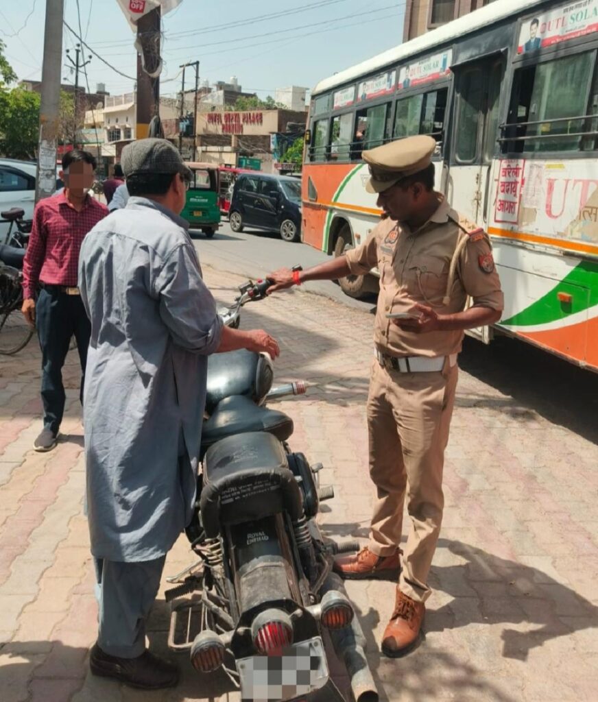 यातायात जागरूकता हेतु चलाए जा रहे अभियान के तहत वरिष्ठ पुलिस अधीक्षक एटा के निर्देशन एवं अपर पुलिस अधीक्षक एटा के निकट पर्यवेक्षण में तथा क्षेत्राधिकारी यातायात श्री संजय कुमार सिंह के नेतृत्व में आज दिनांक 19.04.2026 को जनपदीय यातायात पुलिस द्वारा अभियान चलाया गया। जिसमें मोडिफाइड साइलेंसर, ब्लैक फिल्म, हूटर, ट्रैक्टर ट्रालियों पर बिठाई गई सवारियां, सायरन तथा प्रेशर हॉर्न की विशेष चेकिंग की गई, चैकिंग के दौरान यातायात के नियमों का उल्लंघन करने, ड्रिंक एंड ड्राइव, तीन सवारी, बिना हेलमेट, तथा नाबालिग बच्चों द्वारा वाहन चलाने, बिना नंबर प्लेट, नो पार्किंग में खड़े वाहनों तथा मोडिफाइड साइलेंसर/वाहनों सहित *कुल 118 वाहनों के चालान कर 2,17,000 रूपये का सम्मन शुल्क किया गया* तथा दो पहिया वाहन चलाते समय हमेशा हेलमेट का प्रयोग करने व कभी भी ओवरस्पीड एवं लापरवाही से अपना वाहन न चलाने के संबंध में भी लोगो को जागरूक किया गया।