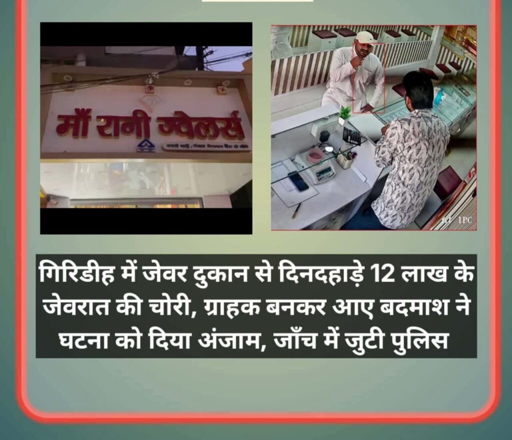 गिरिडीह में जेवर दुकान से दिनदहाड़े 12 लाख के जेवरात की चोरी, ग्राहक बनकर आए बदमाश ने घटना को दिया अंजाम, जाँच में जुटी पुलिस