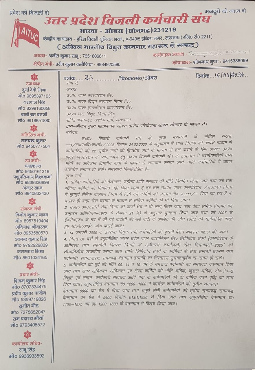 ओबरा (सोनभद्र) उत्तर प्रदेश बिजली कर्मचारी संघ (शाखा-ओबरा) ने अपनी लंबित मांगों और विभागीय समस्याओं को लेकर आंदोलन के द्वितीय चरण का बिगुल फूंक दिया है। इसी क्रम में संघ के पदाधिकारियों और कर्मचारियों ने ओबरा तापीय परियोजना के मुख्य महाप्रबंधक (CGM) को एक ज्ञापन सौंपकर अपनी आवाज बुलंद की।