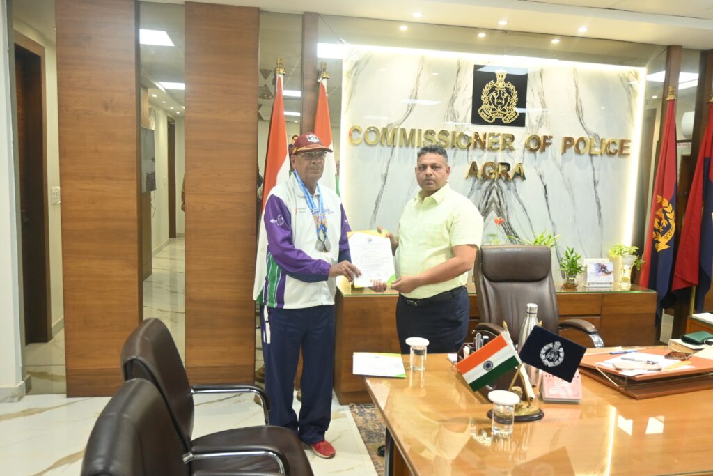आगरा,पुलिस कमिश्नरेट कार्यालय रिजर्व पुलिस लाइन जनपद आगरा मे श्रीमान दीपक कुमार आई.पी.एस.पुलिस कमिश्नर महोदय आगरा द्वारा, एडवेन्चर एण्ड मास्टर स्पोर्ट्स फेडरेशन द्वारा नेशनल मास्टर्स गेम्स 2026 दिल्ली दिनांक 09.04.26.से 11.04.26.तक ईस्ट विनोद नगर स्पोर्ट्स कम्पलैक्स दिल्ली मे एथलेटिक्स चैम्पियनशिप आयोजित की गई। जिसमे रिटायर्ड C F O शिवदयाल शर्मा 65 + आयु वर्ग मे जनपद आगरा स्टेट उत्तर प्रदेश का प्रतिनिधित्व करते हुए 400 मी0 दौड, 800 मी0,1500 मी0 दौड मे द्वितीय स्थान प्राप्त करके सिल्वर मैडल व 4× 400 मी0 रिले रेस, 4 × 100 मी0 रिले रेस मे प्रथम स्थान प्राप्त करके स्वर्ण पदक प्राप्त कर जनपद आगरा सहित उत्तर प्रदेश का नाम रोशन किया। तथा रिटायर्ड C F O शिवदयाल शर्मा को पुलिस कमिश्नर पुलिस कमिश्नरेट आगरा महोदय ने मैडल पहनाकर प्रमाण पत्र प्रदान करते हुए सम्मानित किया। तथा हार्दिक बधाई व शुभ कामनायें देते उज्जवल भविष्य की कामना की।