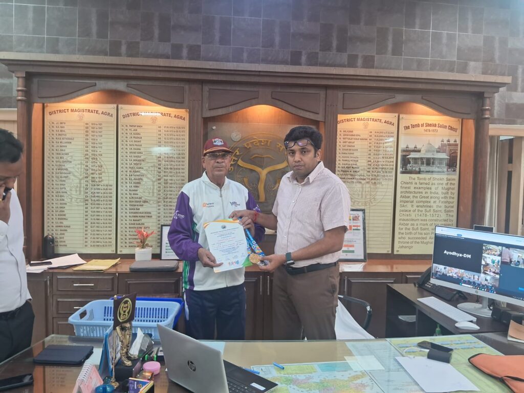 आगरा,जिलाधिकारी कलेक्ट्रेट परिसर कार्यालय जनपद आगरा पर श्रीमान अरविन्द मल्लपा वंगारी आई0.ए0.एस0.महोदय जिलाधिकारी जनपद आगरा द्वारा, एडवेन्चर एण्ड मास्टर स्पोर्ट्स फेडरेशन द्वारा नेशनल मास्टर्स गेम्स 2026 दिल्ली दिनांक 09.04.26.से 11.04.26.तक ईस्ट विनोद नगर स्पोर्ट्स कम्पलैक्स दिल्ली मे एथलेटिक्स चैम्पियनशिप आयोजित हुई। जिसमे रिटायर्ड C F O शिवदयाल शर्मा ने 65 +आयु वर्ग मे जनपद आगरा स्टेट उत्तर प्रदेश का प्रतिनिधित्व करते हुए 400 मी0 दौड, 800 मी0 दौड व 1500 मी0 दौड मे द्वितीय स्थान प्राप्त करके सिल्वर मैडल व 4×400 मी0 रिले रेस, 4×100 मी0 रिले रेस मे प्रथम स्थान प्राप्त कर गोल्ड मेडल प्राप्त करके जनपद आगरा सहित उत्तर प्रदेश का नाम रोशन किया। रिटायर्ड C F O शिवदयाल शर्मा को श्रीमान जिलाधिकारी महोदय जनपद आगरा ने मैडल पहनाकर प्रमाण पत्र प्रदान करते हुए सम्मानित किया। तथा हार्दिक बधाई व शुभ कामनायें देते हुए उज्जवल भविष्य की कामना की।