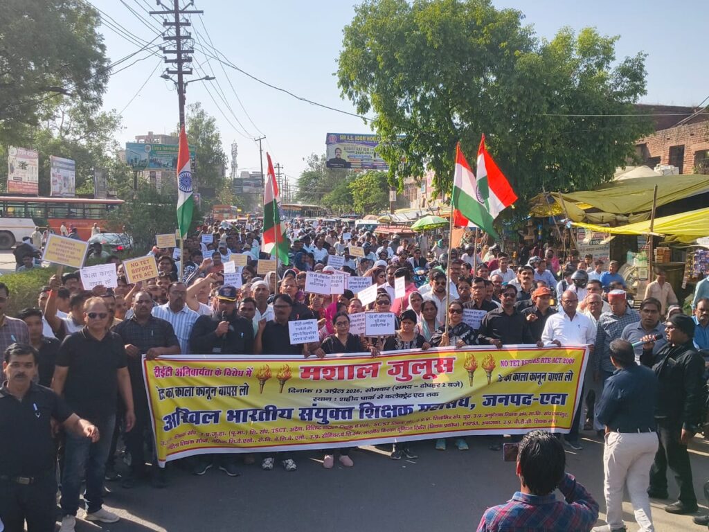 एटा। भारत के सुप्रीम कोर्ट के पारित आदेश के अनुसार भारत में प्राथमिक एवं उच्च प्राथमिक विद्यालयों में कार्यरत शिक्षक शिक्षिकाओं को टेट परीक्षा उत्तीर्ण करना अनिवार्य किया गया है। उपरोक्त टेट अनिवार्यता कानून को वापस कराने की मांग को लेकर अखिल भारतीय संयुक्त शिक्षक महासंघ एटा के बैनर तले आज़ जनपद के शिक्षक शिक्षिकाओं ने एकत्रित होकर शहीद पार्क से कलैक्ट्रेट परिसर तक हाथों में मशाल जुलूस लेकर तथा टेट अनिवार्यता समाप्त करो।काला कानून वापिस लो लिखीं पट्टिकाए लेकर सड़कों पर पैदल मार्च निकाला हजारों की संख्या में उपस्थिति जनसमूह की साउंड सिस्टम के माध्यम से टेट अनिवार्यता समाप्त करने की मांगों की आवाज शहर की सड़कों पर गूंजती रही।