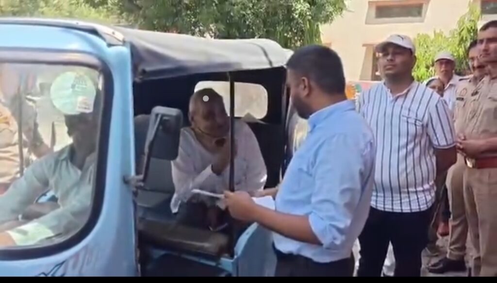 डीएम अपने कार्यालय से निकल कर बाहर ऑटो रिक्शे पर पीड़ित बुजुर्ग की फरियाद सुनने,